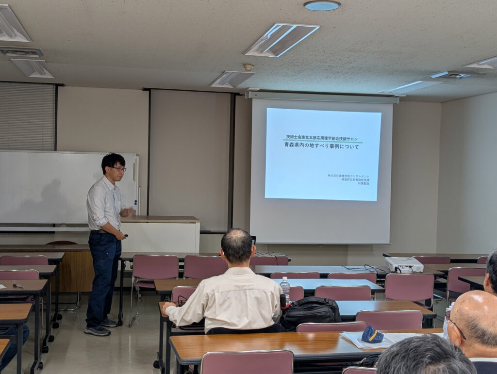 令和7年10月17日(金)の18:00より、仙台市戦災復興記念館(第1会議室)にて、第3回技術サロンを開催いたしました。今回は、株式会社復建技術コンサルタント 秋葉聖哉氏から「青森県内の地すべり事例について」という演題でお話をいただき、布原地質調査事務所 布原啓史氏から「鉱物の熱発光データを用いた新しい熱源位置推定方法-QGISプラグインによる東北地方3地域への適用」の報告をいたしました。秋葉様からは、青森県内で発生した豪雨による地すべり被害について、事例を挙げて紹介していただきました。布原氏からは、熱発光強度測定(TL強度)を用いた熱源位置の推定方法として、布原氏の開発したTLインバージョン法についてご紹介していただきました。今回の技術サロンには、講師を含め12名にご参加いただきました、ありがとうございました。